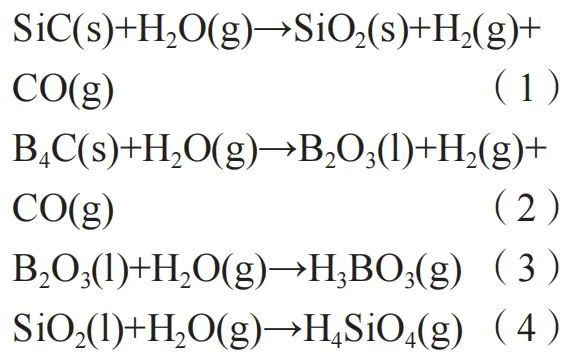 然而在航空发动机运行过程中,碳烃化合物燃烧会产生大量的水蒸气, SHCMC 的实际应用环境为高温水氧环境。此环境下,B4C 和 SiC 会与水蒸气发生如下反应 [37–39]。