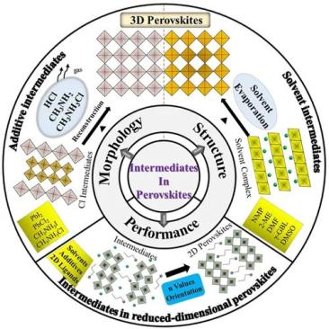 -Perovskite Solar Cells. While solution processing significantly reduces the threshold and cost of perovskite solar cells, the intricate composition and nonequilibrium nucleation of the perovskite precursor can result in leaky films. Yanlin Song (宋延林), Na Wang (王娜), and coworkers provide a comprehensive overview of the advances in intermediates of perovskite solar cells, with a focus on the growth and manipulation of perovskite films. They discuss the challenges associated with obtaining high-quality perovskite films and highlight the importance of nucleation thermodynamics and crystal growth kinetics.