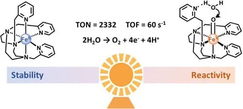 -Water Oxidation by Photocatalysis. Photocatalytic water oxidation reaction by transition metal complexes remains a challenge because of the poor stability of the complexes under irradiation, especially for earth-abundant metal catalysts. Li-Zhu Wu (吴骊珠) and coworkers develop a water splitting system by using an iron-based organic complex. The turnover number and turnover frequency values of 2332 and 60 s−1 are the highest known to date among iron-based homogeneous water oxidation systems under visible light irradiation.