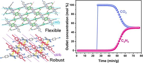 -Hydrogen-Bonded Organic Frameworks. Hydrogen-bonded organic frameworks (HOFs) have emerged as a promising candidate for gas adsorption and separation. However, most HOFs are flexible and collapse easily after activation. Shengchang Xiang (项生昌), Zhangjing Zhang (张章静), and coworkers report the construction of flexible and robust HOFs through rational selection of donor–π–acceptor molecules as building units. The obtained three-dimensional HOF with a sticked-layer structure, namely HOF-FJU-8, displays good chemical and thermal stability. Furthermore, the activated framework, HOF-FJU-8a, exhibits adaptive adsorption and stronger binding affinity for C2H2 than CO2.