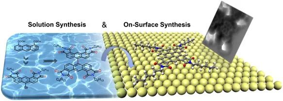-On-Surface Chemistry. Imide-containing conjugated molecules have emerged as a highly promising class of building blocks for constructing n-type semiconducting materials. Deqing Zhang (张德清), Lifeng Chi (迟力峰), and coworkers present a novel synthesis of electron-deficient bisanthene tetraimide (ATI) via a combined approach of solution synthesis and on-surface synthesis. The chemical structures, electronic states, and aromaticity of ATI are revealed by scanning probe microscopy, scanning tunneling spectroscopy, and density functional theory calculations.