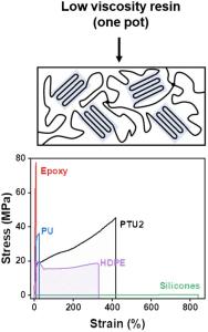 -Ultratough and Dynamic Thermosets. Thermosets based on direct curing of multifunctional monomers offer processing flexibility not possible with thermoplastics. However, this type of thermoset is typically amorphous since it is difficult to meet the stringent requirement of long-range molecular regularity for crystallization. Ning Zheng (郑宁) and coworkers report the solvent-free synthesis of a crystallizable poly(thiourethane)thermoset directly from the curing of low-viscosity liquid precursors. The poly(thiourethane) shows good mechanical strength as well as excellent shape memory.