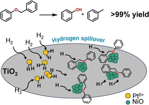 -C–O Bond Activation. Highly efficient C–O bond activation is a fundamental strategy in the depolymerization and hydrodeoxygenation of chemicals with oxygen-containing functional groups, such as oil, coal, and biomass. Huizhen Liu (刘会贞) and coworkers report the fabrication of bimetallic catalysts with atomically dispersed Pt and NiO clusters on different supports that show outstanding activity for the hydrogenolysis of benzyl phenyl ether with >99% yield of phenol and toluene.
