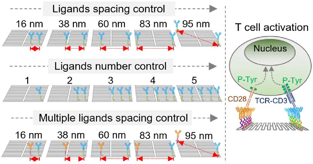 -DNA Origami for T Cell Activation. The spatial arrangement of related receptors on T cells undergo sophisticated changes from nanoscale to microscale during activation. Lele Sun (孙乐乐), Zhuang Liu (刘庄), and coworkers have cleverly taken advantage of DNA origami to precisely organize antibodies for T cell activation. They constructed T cell expanders with DNA origami for expanding therapeutic T cells in vitro and achieved effective adoptive tumor immunotherapy in a mouse tumor model experiment thus demonstrating that the DNA nanostructure-based ligands can be a unique tool in studying immune cell activations and cell-based cancer immunotherapies.