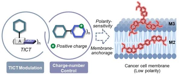 -Plasma Membrane Polarity Sensor. Polarity is a critical microenvironmental factor of the plasma membrane that can offer valuable insights into various biological processes. Ying Zhou (周莹), Jong Seung Kim, and coworkers propose a novel strategy for the construction of fluorescent agents to measure plasma membrane polarity by conjoining twisted intramolecular charge transfer modulation and charge number control. As a result, two fluorescent agents with high polarity sensitivity, excellent turn-on ratios, and superior targeting ability are developed for plasma membranes.