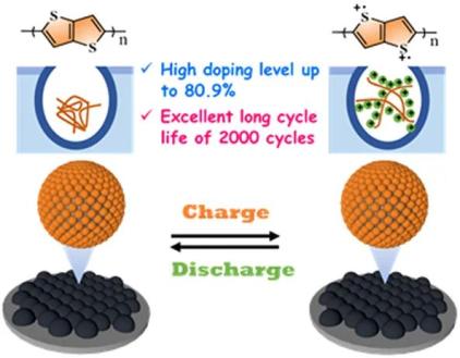 -Lithium-Ion Batteries. Conducting polymers have long been studied as cathode materials for lithium-ion batteries, but the low doping level and poor cycling stability limit their applications. Jixing Yang (杨继兴) and coworkers report a method of nanopore-confined in situ electropolymerization to prepare nanostructured polythiophene-type porous cathodes, achieving significantly improved doping availability and long cycle life.