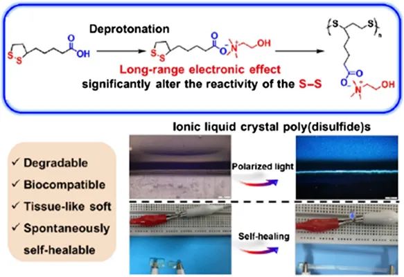 -Biomimetic Ionic Elastomers. Poly(disulfide)s have been widely used in flexible wearable electronics, smart materials, and drug delivery. The synthesis of poly(disulfide)s typically utilizes external stimuli or toxic initiators to promote polymerization. Zhengwei You (游正伟) and coworkers develop a deprotonation-promoted ring-opening polymerization of thioctic acid as a highly effective and simple method to synthesize poly(disulfide)s. The method allows for preparation of biomimetic ionic elastomers with combined bionic softness, biodegradability, and biocompatibility, showing potential for biomedical applications.