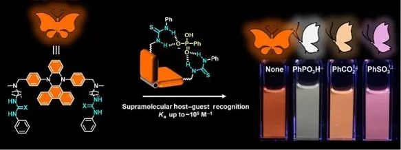 -Fluorescent Sensors for Anions. Zezhou Zong, Qi Zhang (张琦), and Da-Hui Qu (曲大辉) report the design of a multicolor fluorescent sensor based on the highly conformation-dependent emission of diphenyl-9,14-dihydrodibenzo[a,c]phenazine fluorophores bearing two anion-binding arms. By engineering the molecular structure, high binding constants with phosphate anions can be achieved up to 105 M−1, allowing a very low detection limit and direct visual discrimination of structurally similar oxoanions. This design strategy provides a simple fluorescent sensing solution for analyzing small-molecule phosphates with anti-interference performance.