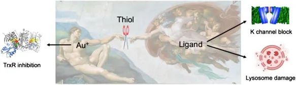 -Anticancer Au(III) Complexes. Based on efficient thioredoxinreductase (TrxR) inhibition, anticancer metallodrugs can disturb the redox balance of cancer cells. However, in this model, the role of the ligands coordinated to gold is often overlooked. Xue-Quan Zhou, Sylvestre Bonnet, and coworkers present a series of tetrapyridyl Au(III) complexes that exhibit thiol-induced release of a Au(I) ion and a tetrapyridyl ligand. The released ligands accumulate in the lysosome, which can efficiently bind to potassium channels, while the Au(I) can inhibit the activity of TrxR enzyme. Thus, such tetrapyridyl Au(III) complexes can be a dual-target drug for two important proteins (enzyme and channel) to induce the cancer cell death.