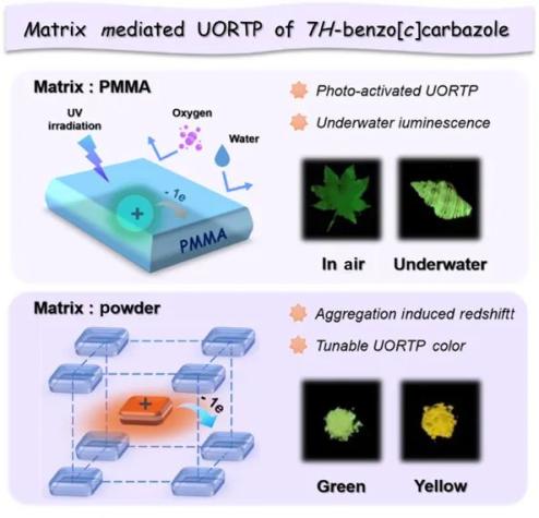 -Ultralong Phosphorescence. Ultralong organic room temperature phosphorescence materials hold promise in bioimaging, advanced encryption, anti-counterfeiting, and sensors with high sensitivity. Zhiyong Ma (马志勇) and coworkers report room-temperature phosphorescence from benzocarbazole derivatives. Pure powders of benzocarbazole and its derivatives merely exhibit blue fluorescence at ambient conditions. In contrast, when benzocarbazole and its derivatives are dispersed into polymer or powder matrices, strong photo-activated green ultralong phosphorescence can be observed at room temperature.