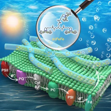 -Photosynthetic Hydrogen Evolution. In artificial photosynthesis, synthetic diiron complexes are popular "[FeFe]-hydrogenase mimics in the fabrication of photocatalyst–protein hybrid structures to amplify hydrogen generation capability. However, constructing a highly bionic and efficient catalytic hybrid system is a major challenge. Fude Feng (冯福德), Shu Wang (王树), and coworkers report a biohybrid system in which a diiron molecular catalyst is incorporated into a protein fibril structure. The biohybrid system achieves efficient H2 generation with a turnover number of 2.3 × 103, outperforming previously reported diiron catalyst–protein hybrid systems.