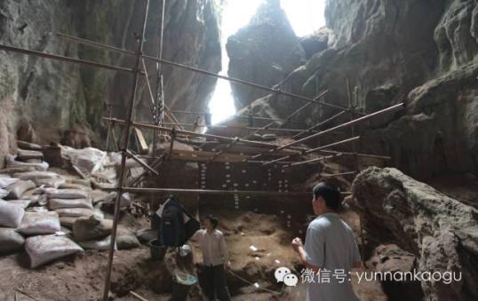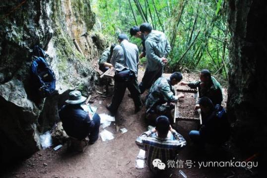 发掘现场1996年,云南省文物考古研究所对该洞穴遗址进行调查勘探。发现娜咪囡洞穴为那米那罗歌山脊之西断层陡崖底阶地后缘山腰处从北向南溶洞群4个大洞的第3个洞穴,洞口朝正西向,由一块坍塌的三角状巨石靠北壁把大部分洞口阻塞而形成一个正三角状裂隙式洞口,使得现存洞口很隐秘。洞穴向东延伸,形如略扁的钟状,洞穴内部面积约300平方米。