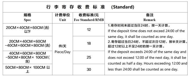 行李寄存按物品规格、件数、天数收费,收费标准如下: