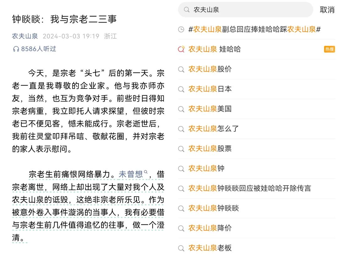 在农夫山泉官方微信公众号发文《钟睒睒:我与宗老二三事》澄清此前谣传的种种细节,但网友依然不买账,反而认为是一种“背刺”,忘恩负义的传言依旧甚嚣尘上。