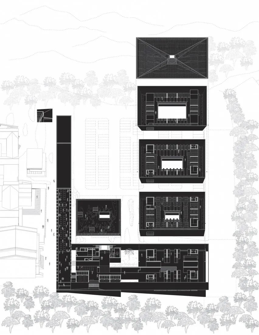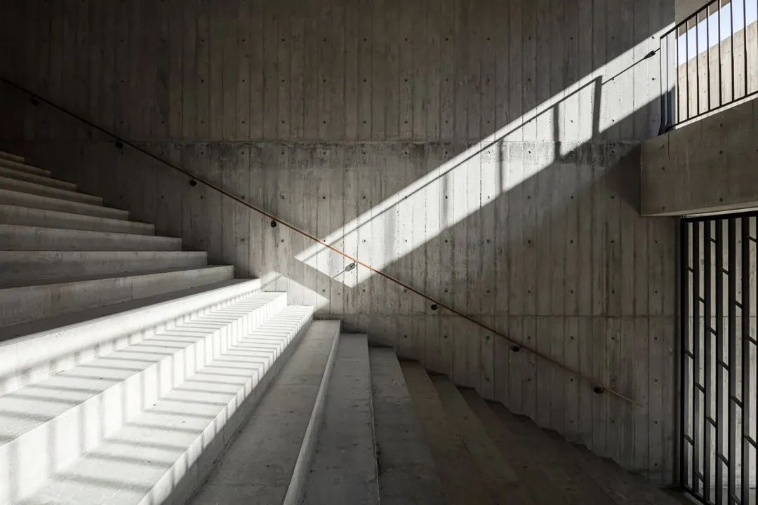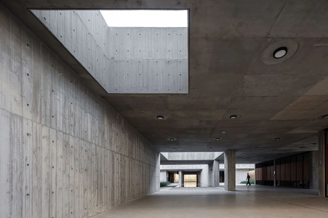 中庭由四层悬垂的体块堆叠而成,与骨灰安置所区域相一致。这个简单的构造创造了自然采光的周边回廊,也为围绕中庭的视觉相互连接通道打开了空间。顶部是现浇混凝土天窗,将屋顶拉向中庭中部。