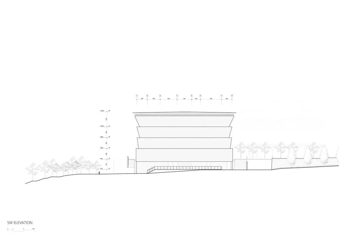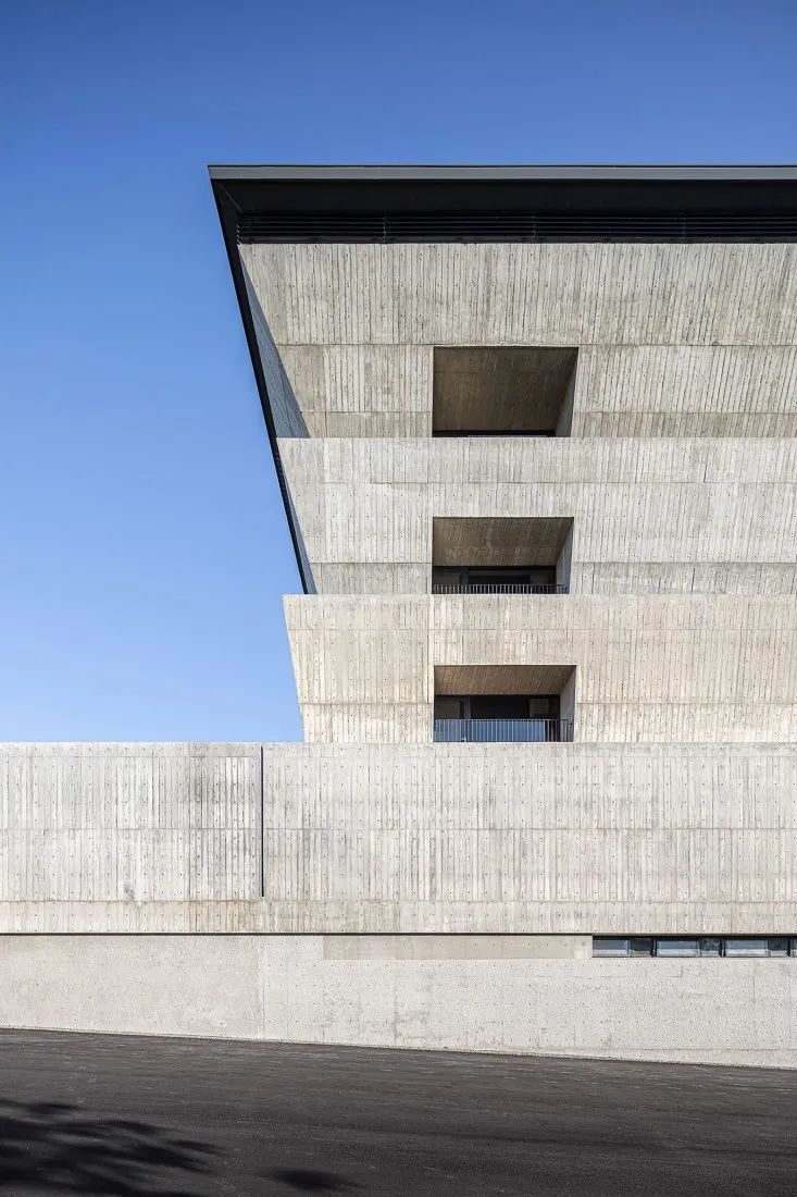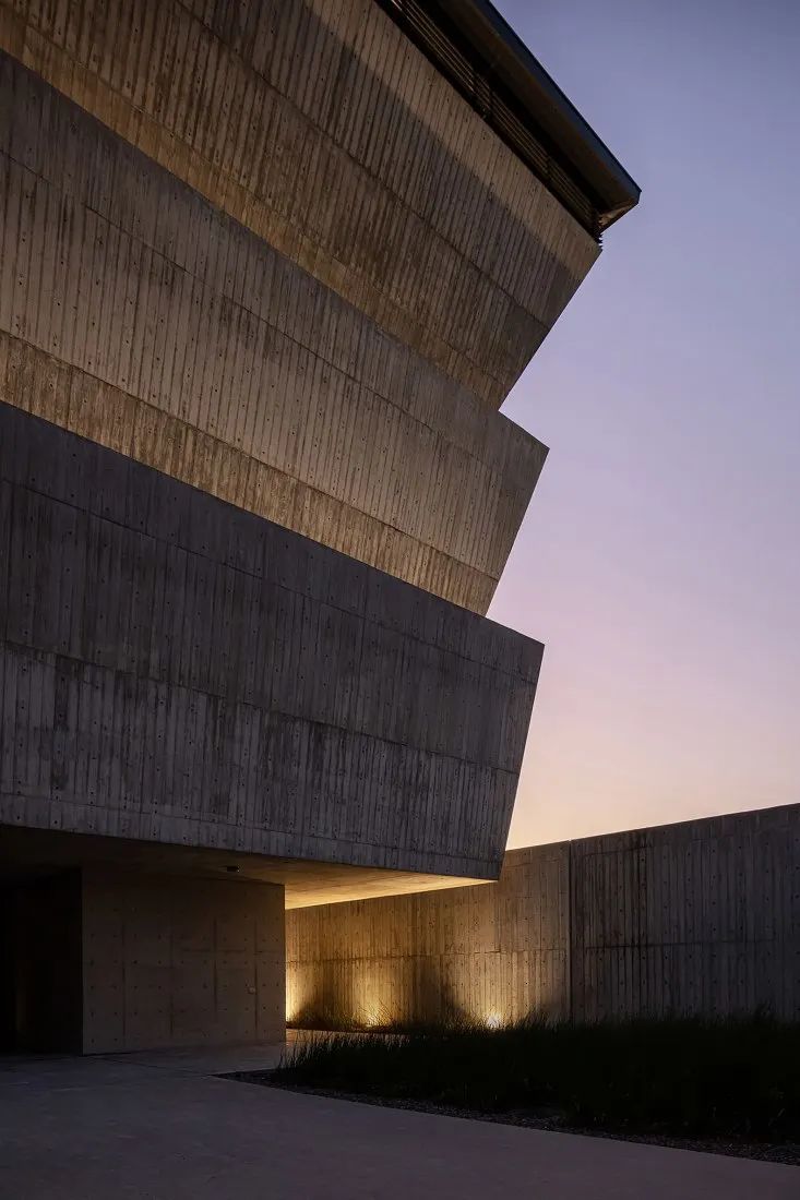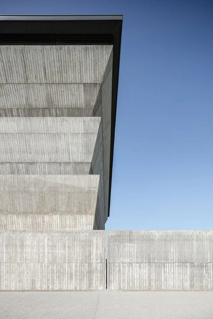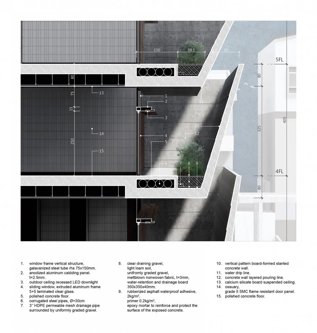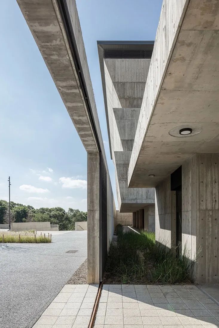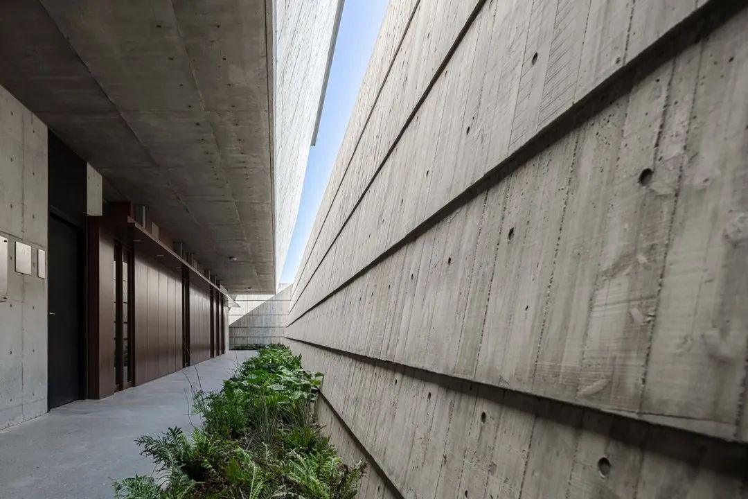 © YuChen Chao Photography倾斜重叠的墙壁堆叠赋予了主体建筑特有的外观。这种堆叠构造出一种群山环绕的视觉效果。倾斜的、向天空开放的墙壁记录着温暖气氛的阳光,陪伴人们面对死亡。这些倾斜墙壁底部的周边内置花池,雨水及阳光的撒落可以灌溉建筑物里的植物。从这些自然元素中,清晰地感受到自然的风土与生命力,并间接消除对于纳骨塔的反感与恐惧,让逝者长眠之地对生者还是可亲可近。