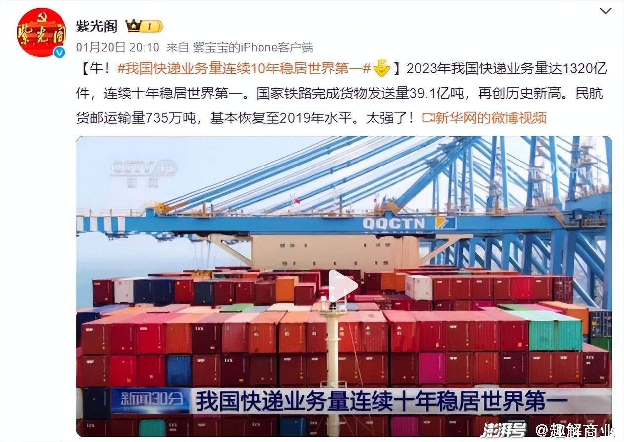 据“趣解商业”了解,2012年,全国规模以上快递业务量累计完成57亿件;2017年,我国完成快递400亿件;到了2023年,我国快递业务量累计完成高达1320.7亿件。同时,我国快递业务量连续十年稳居世界第一。