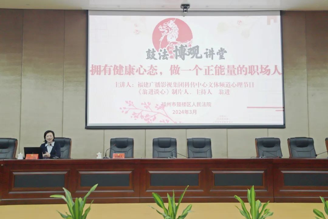 为引导全院干警理性对待压力、培养正确认知、树立积极心态、调控自我情绪,3月7日,鼓楼法院邀请国家首批二级心理咨询师、心理治疗师、福建广播影视集团科传中心文体频道心理节目《翁进谈心》的制片人、主持人翁进老师为大家带来题为“拥有健康心态,做一个正能量的职场人”的心理健康讲座。讲座由鼓楼法院党组副书记、副院长袁文伟主持。