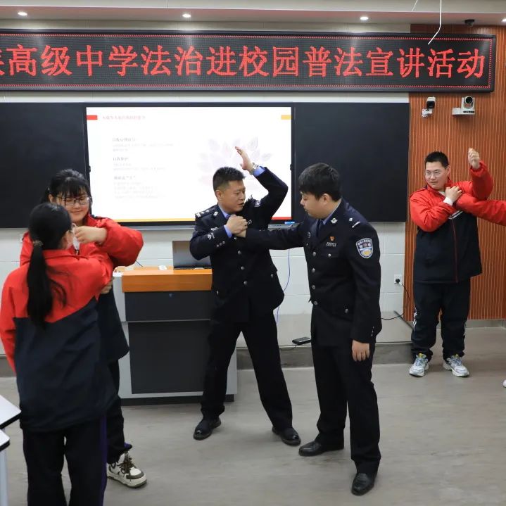 在法治课堂的尾声,法治副校长为同学们现场教学“防身术”组合大餐,通过对相关动作的分解,以实用为出发点,重点演示了解脱控制、一步逃脱等动作。学生们结对练习动作,法治副校长及时对不规范的动作进行纠正,确保学生们能够掌握动作要领,提高防御水平。法治副校长对学生们说,他教给大家的主要是脱身技巧和简单的对抗、擒拿动作,并不鼓励学生们在遭遇歹徒时与其纠缠,而是如何安全逃脱、如何加强自我保护。在理论知识学习的基础上,通过防卫技能、技巧与实战演练相结合,让学生们充分树立防范意识,强化自我保护,切实增强自我防卫意识和处置能力。