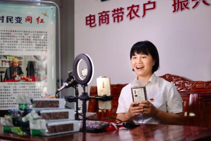 谭新萍正在直播卖货。(作者供图)2012年,谭新萍办起了萍乡市首个“农村E邮”服务站,帮助农民销售土特产。她不仅帮助村民脱贫致富,还耐心细致地指导留守妇女,帮助她们实现了稳定就业。目前,50余名村民在她的帮助下稳定就业,其中10多名妇女从事直播带货。