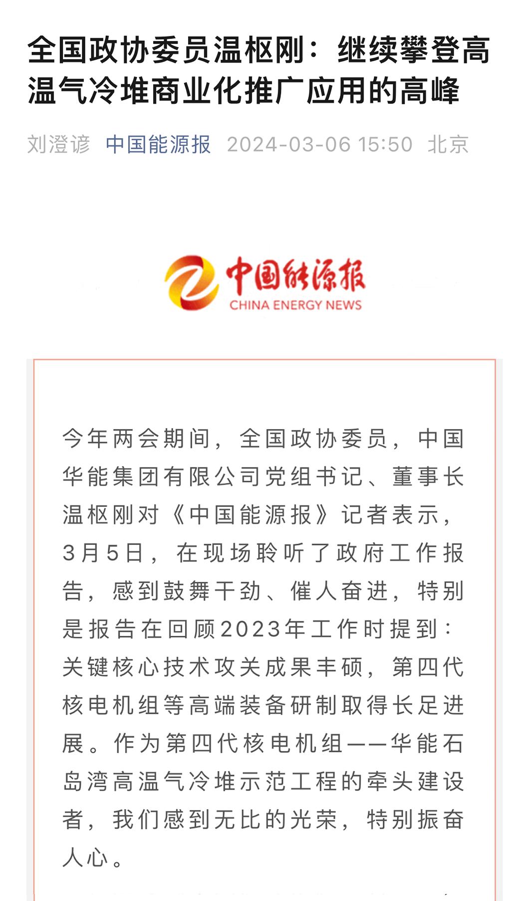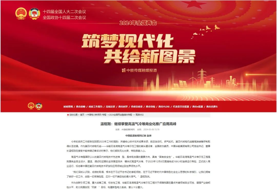 全国政协委员温枢刚:发挥高温气冷堆核电“四链”融合优势,加快形成新质生产力