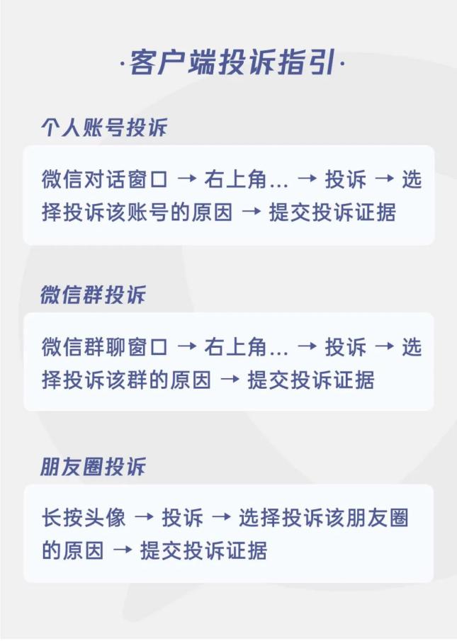 温馨提示作为即时通讯工具和社交平台,微信致力于为用户提供一个绿色、安全、健康、便捷的网络生态环境。希望广大网友共同监督,发现相关违法违规行为可通过微信客户端、腾讯卫士小程序进行投诉,一起携手打造一个善意友好的网络环境。