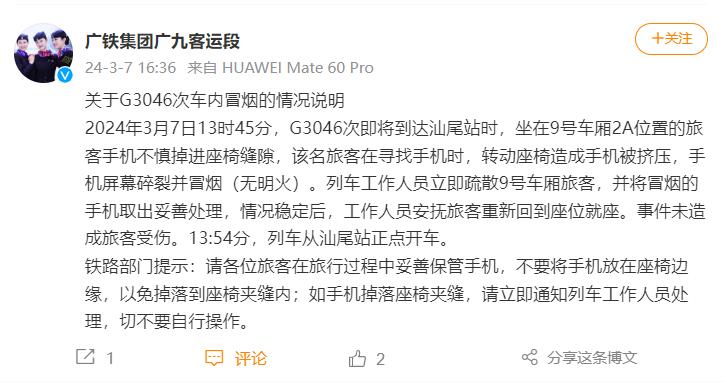根据通报,2024年3月7日13时45分,G3046次即将到达汕尾站时,坐在9号车厢2A位置的旅客手机不慎掉进座椅缝隙,该名旅客在寻找手机时,转动座椅造成手机被挤压,手机屏幕碎裂并冒烟(无明火)。列车工作人员立即疏散9号车厢旅客,并将冒烟的手机取出妥善处理,情况稳定后,工作人员安抚旅客重新回到座位就座。事件未造成旅客受伤。13:54分,列车从汕尾站正点开车。铁路部门提示:请各位旅客在旅行过程中妥善保管手机,不要将手机放在座椅边缘,以免掉落到座椅夹缝内;如手机掉落座椅夹缝,请立即通知列车工作人员处理,切不要自行操作。