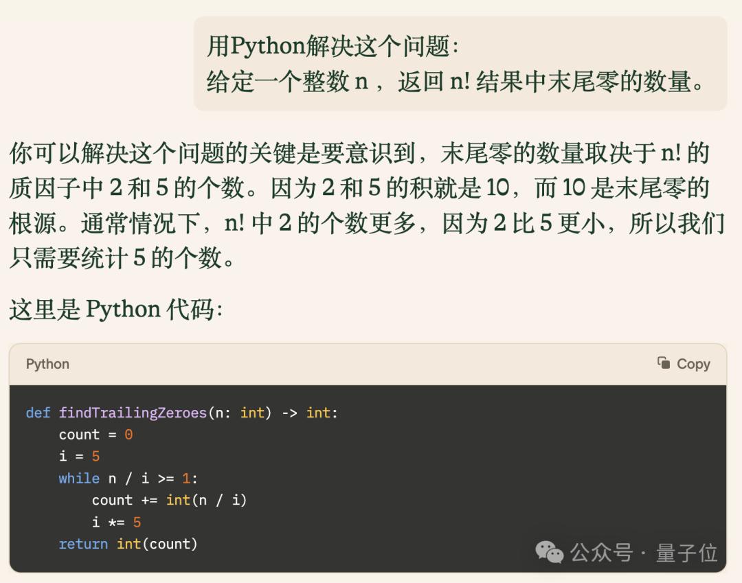 接下来再提升一下难度看看,让其分析一个数字的阶乘中末尾有多少个0。