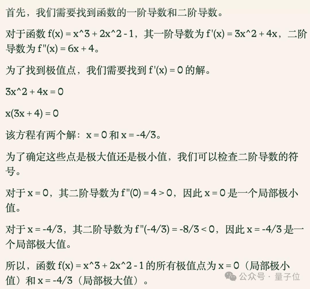 看完代码,再来测测Pi的数学能力怎么样,让它做做关于导数的题目:求出函数f(x)=x⊃3;+2x⊃2;-1的极值点