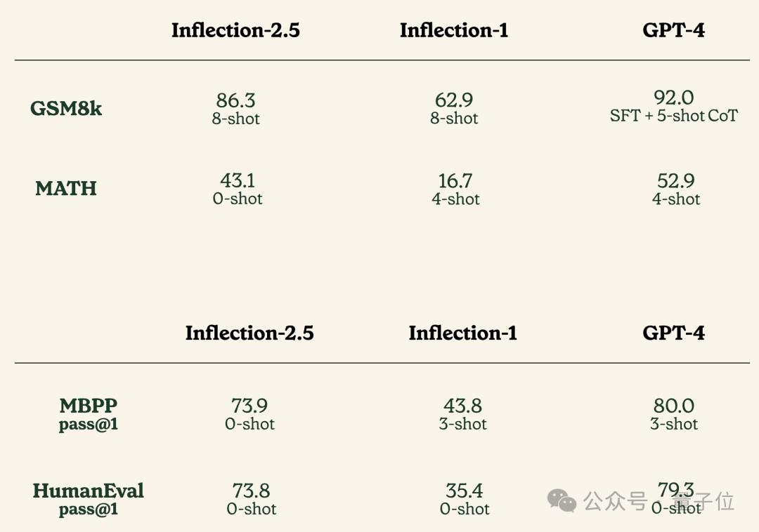 通过Pi的表现,可以看出其背后的Inflection-2.5模型的确可圈可点。而从官方自己公布的测试数据来看,无论是综合能力还是各个子项,Inflection-2.5的表现都紧随GPT-4。