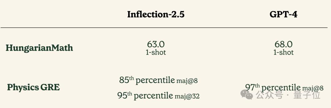 在这些常规的数据集之外,Inflection还挑战了匈牙利高考数学试题和GRE物理测试,结果几乎与GPT-4打成平手。
