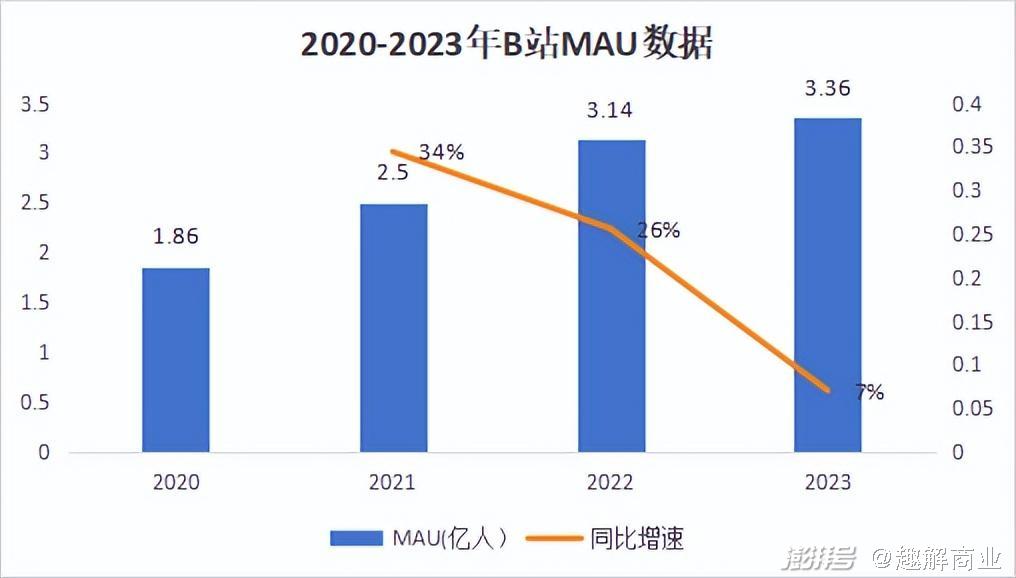 数据显示,2023年B站全年MAU为3.36亿人,较上一年年同比增加了7%;但是,从2021年B站MAU突破2.5亿人之后,B站的月活用户增速就在不断放缓,同比增幅从34%一直降到7%。