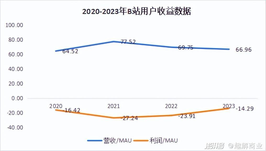 但是到了2022年,B站用户规模突破3亿人,同比增长26%,然而营收同比增速只有13%,平均每个用户给B站营收贡献了不到70元;到了2023年,用户增速的7%也超过了营收增速的3%,平均每个用户的营收贡献继续降至66.96元。