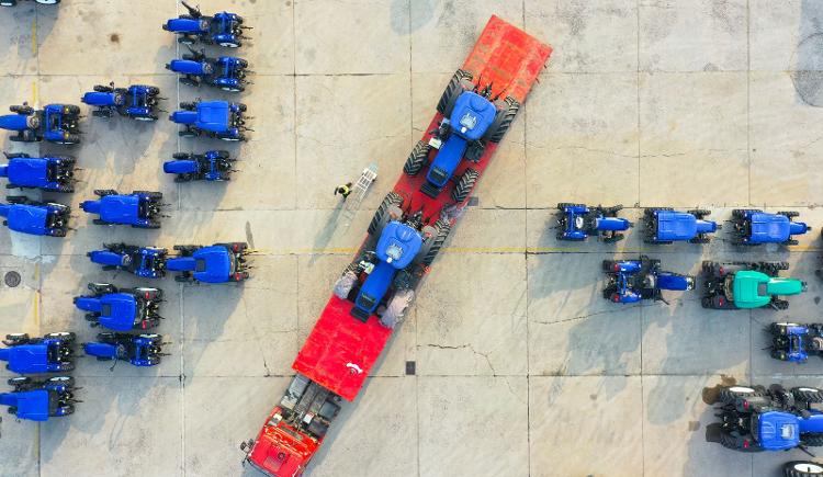 运输车将拖拉机发往全国各地在潍柴雷沃物流发运区,忙碌的身影穿梭在一台台农机之间。生产下线的农机整齐划一的停靠在两侧,一台台寄托着农机人新年新愿的拖拉机、收割机等,正准备踏上“龙专列”奔赴用户手中。据了解,目前每天有超过600台各类农机产品从这里发往全国各地。