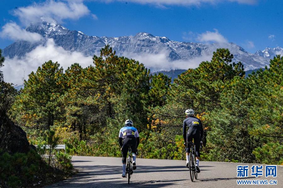2023七彩云南格兰芬多自行车节丽江站参赛选手在比赛中向着玉龙雪山方向冲刺(2023年11月10日摄)。新华网发(2023七彩云南格兰芬多自行车节主办方 供图)云南成为人们“乐享山水”的动感地带,生态的高颜值逐步转化为产业的新价值和发展的硬实力,“绿水青山”成为“金山银山”。