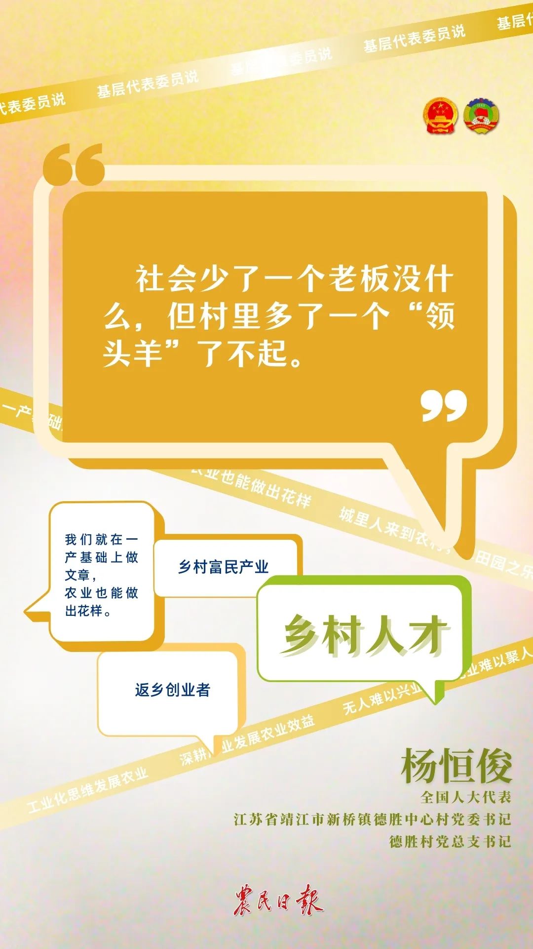 人才亦是如此。无人难以兴业,无业难以聚人。今年的政府工作报告指出,着眼促进农民增收,壮大乡村富民产业,发展新型农业经营主体和社会化服务,培养用好乡村人才。