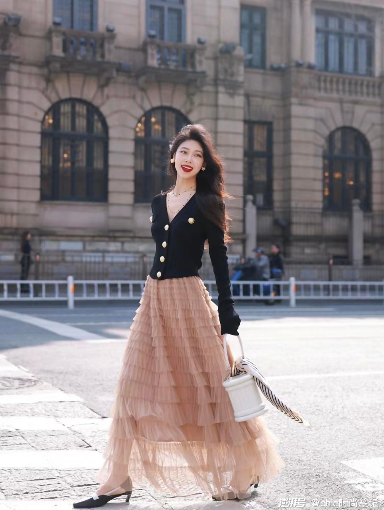 黑色针织v领上衣点缀金色纽扣,优雅又贵气,下身搭配一条裸粉色蛋糕半身长裙,轻盈灵动,搭上一个白色水桶包和一双黑色低跟鞋,把法式优雅发挥到极致。