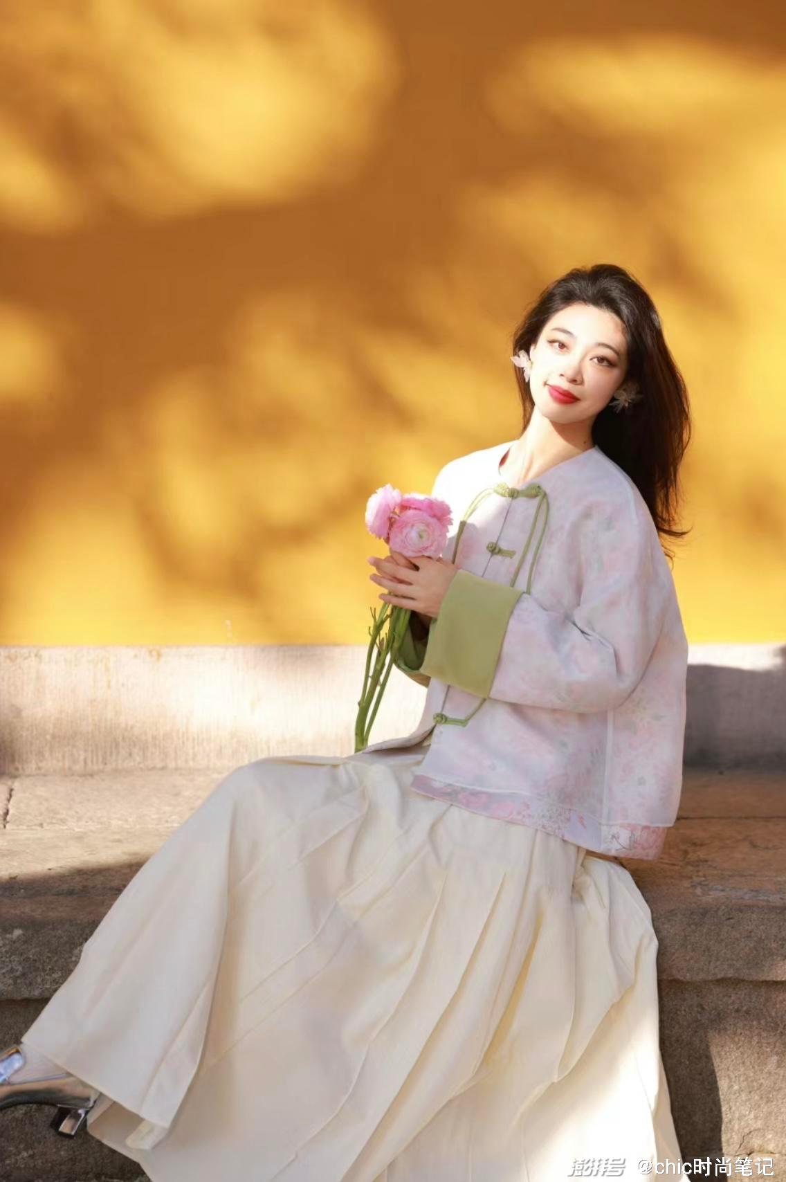 浅粉色新中式上衣搭配浅绿色袖口和流苏,红绿的搭配很有春日的feel,新中式的简约和温婉并存,下身搭配一条米色百褶长裙,一整个温柔感十足。02俏皮裤装