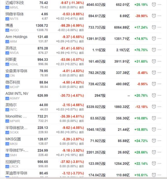 迈威尔科技收跌逾11%,纳微半导体跌近10%,博通跌7%,ARM跌6.6%,阿斯麦ADR跌逾5%,安森美、微芯科技、英特尔、高通、台积电、超微电脑、美光科技纷纷走跌。半导体板块指数ETF和费城半导体指数均跌超4%。