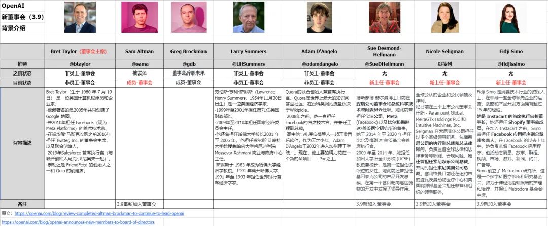 2023年11月29日,OpenAI新的董事会主席Bret Taylor(前Salesforce高管、前Twitter董事会主席)宣布Sam Altman回归并组建新的董事会,并承诺接下来做加强公司的治理,核心包括三件事: