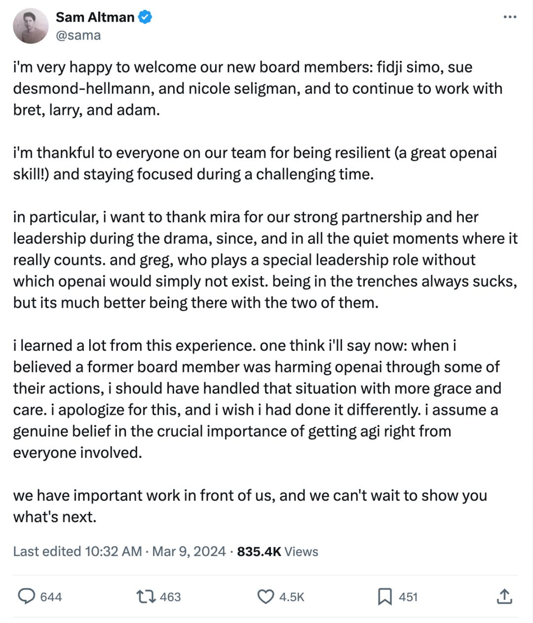 看的出来,Sam Altman与他的坚定支持者Mira Murati等小团体,与前任董事会成员的矛盾依然没有化解,只是我们现在还无法得知背后的来龙去脉到底是什么。