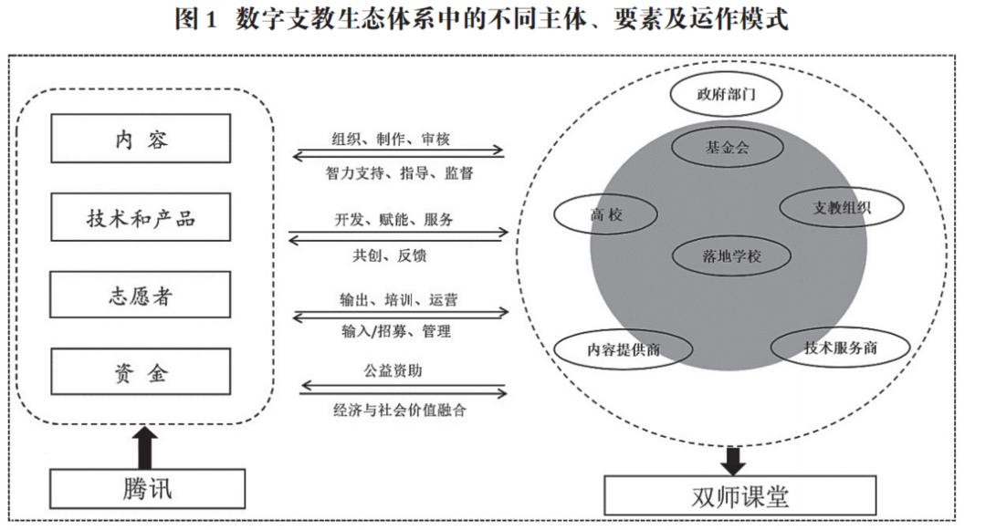 鉴于研究主题与行业代表性实践的匹配性,本文以近年来快速发展的腾讯SSV数字支教项目为例,着重探讨数字时代支教生态体系的主体、要素、特征和价值。2021年,腾讯进行了第四次战略升级,SSV是其基于实践探索出的“共益型”企业履行社会责任的新理念和新范式,强调将社会责任融入产品及服务之中,实现经济与社会价值创造过程和结果的高阶均衡。在SSV理念和战略引领下,腾讯立足我国乡村教育资源和需求,抓住乡村教育短板,于2021年起创建了“数字支教实验室”,并通过数字支教项目在乡村教育振兴、促进教育公平方面持续发力。作为数字科技企业,腾讯在探索乡村教育问题的“解法”时充分发挥了数字技术的工具作用和要素价值,以服务落后地区乡村学校为抓手,以“双师课堂”为实践形式,构建全要素、全流程、包容型的数字支教生态体系,力促乡村外部支持和内部条件的耦合,对于促进传统支教服务转型升级、以数字化赋能乡村教育振兴以及依托数字技术打造可持续的教育帮扶模式具有积极启示意义和借鉴价值。