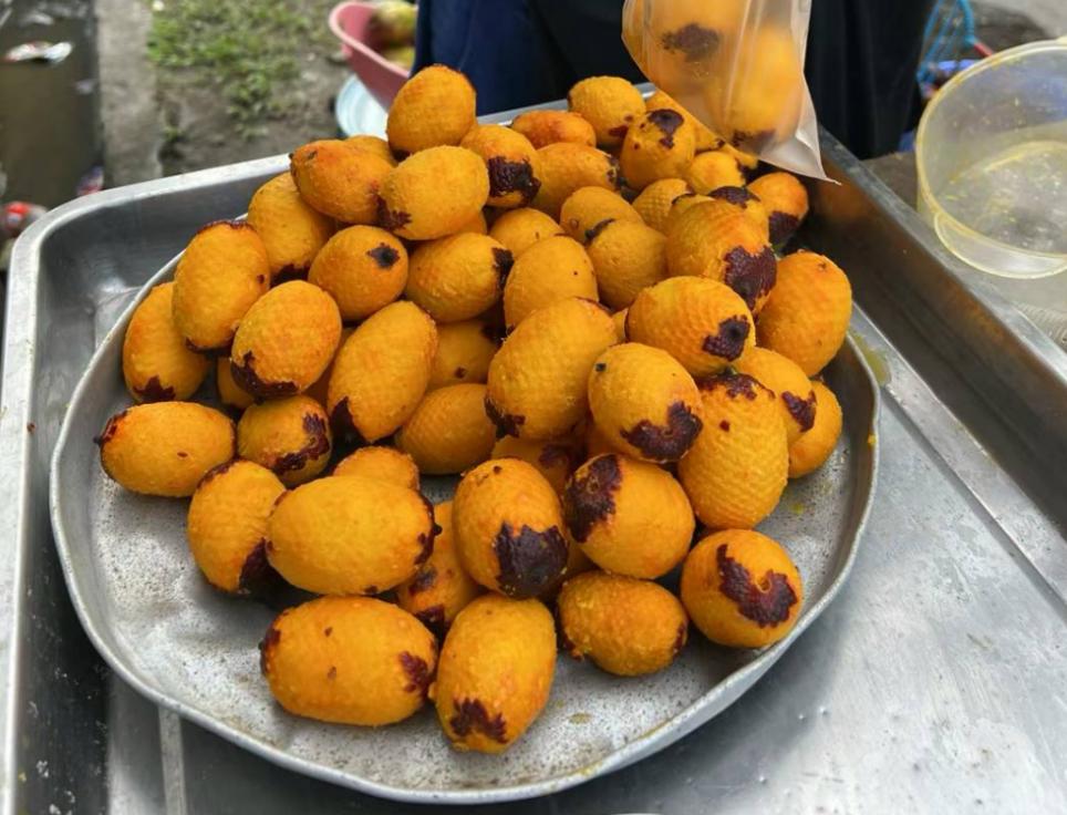 曲叶矛榈我只在热带雨林地区见到过,这种果子喜欢聚集生长在一起,它的树木可高达三十五米。这种果子在当地广受欢迎,哪怕是走路还摇摇晃晃的小孩,也会手里拿着一个当街啃。尽管它的表皮看起来很像蛇皮果,味道却全然不同。除掉表皮,里面的果肉又硬又涩,当地人会拿来直接蘸盐吃,我却完全没有找到对这种果子的审美点。