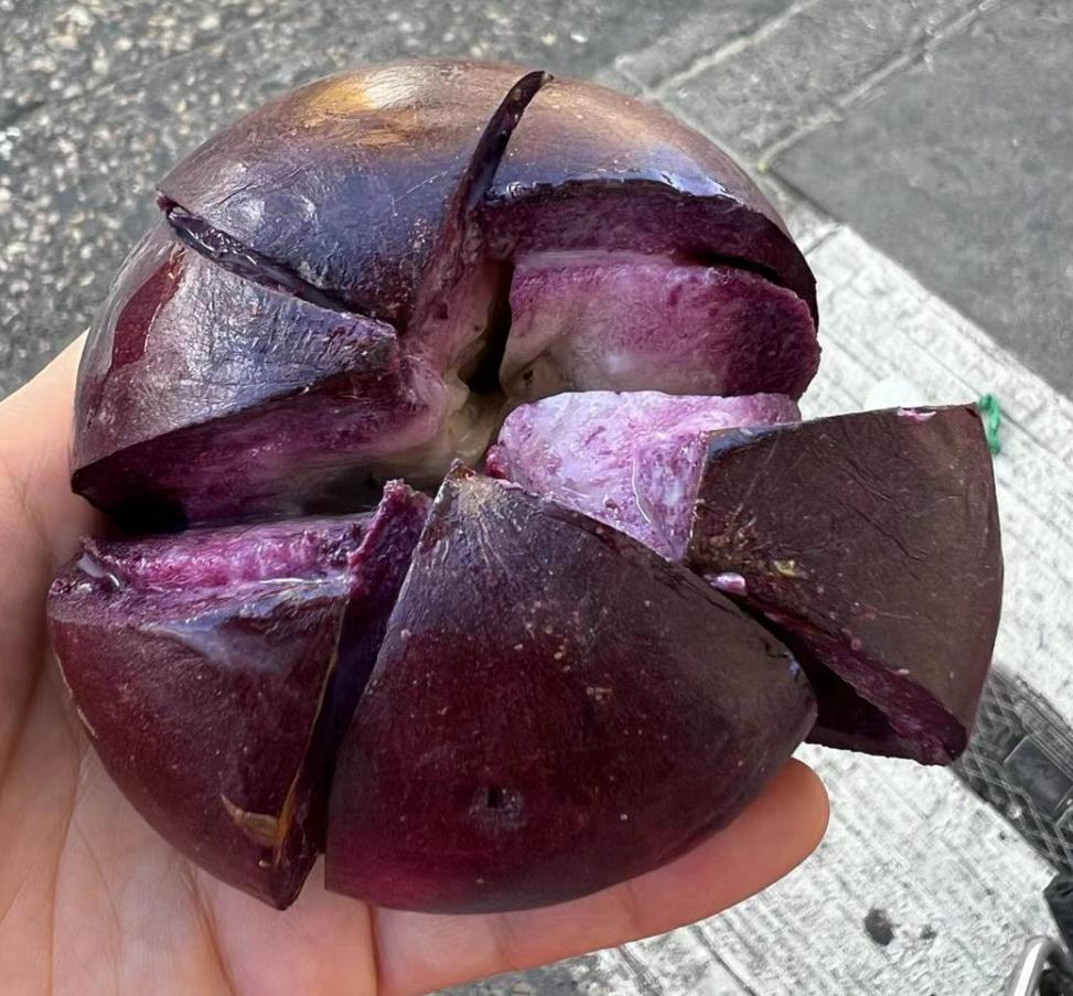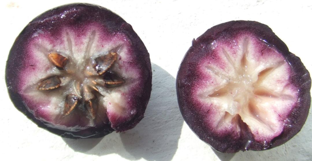 牛奶果的外皮颜色很像山竹,流出来的汁水是奶白色的。这种果子又叫金星果(starapple),因切开的剖面呈星型而得名。