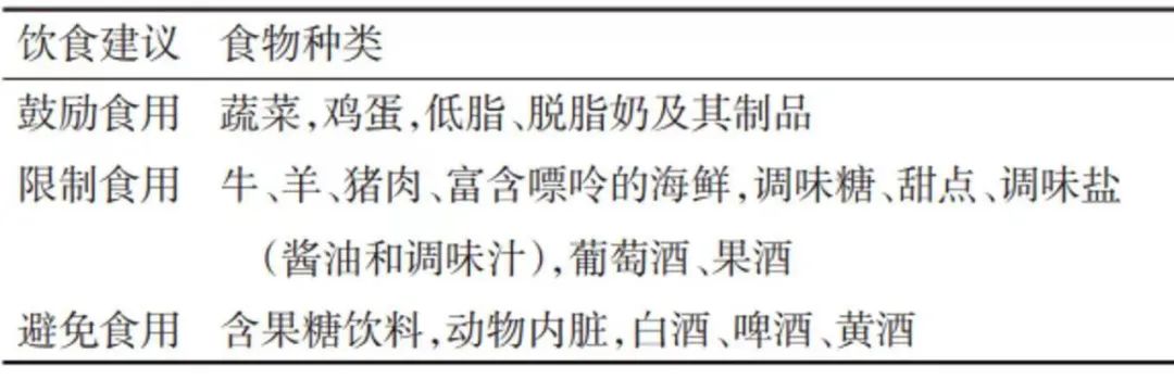 1. 膳食:提倡健康饮食,多吃新鲜蔬菜,通过适量食用鸡蛋、低脂、脱脂奶制品、富含ω-3 多不饱和脂肪酸的鱼类、豆类及豆制品(肾功能不全者须在专科医师指导下食用)来获取优质蛋白质(详见表1)。限制嘌呤含量高的动物性食物的摄入(详见表2,红色底色部分为需要限制的食物;黄色为可适量进食但不宜大量;绿色为放心食物)。