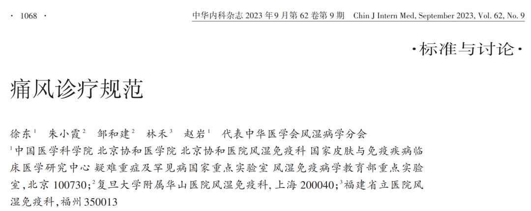 徐东, 朱小霞, 邹和建, 等. 痛风诊疗规范[J]. 中华内科杂志, 2023, 62(9): 1068-1076. DOI: 10.3760/cma.j.cn112138-20221027-00796.