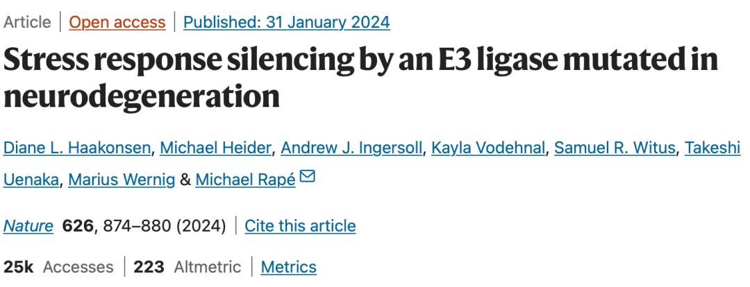 [2]Haakonsen DL, Heider M, Ingersoll AJ, Vodehnal K, Witus SR, Uenaka T, Wernig M, Rapé M. Stress response silencing by an E3 ligase mutated in neurodegeneration. Nature. 2024 Feb;626(8000):874-880. doi: 10.1038/s41586-023-06985-7. Epub 2024 Jan 31. PMID: 38297121; PMCID: PMC10881396.