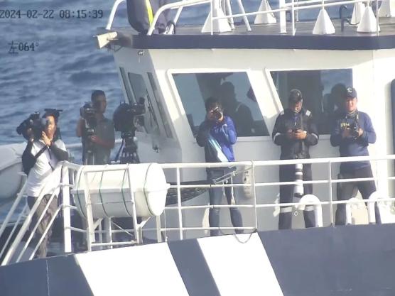 ▲ 2024年2月22日,中国海警局拍摄到菲律宾非法侵闯黄岩岛邻近海域的公务船上有多名携带“长枪短炮”的记者。近期,菲律宾还变本加厉,无端指责中国渔民使用氰化物捕鱼,把本国渔民为了经济利益破坏海洋环境的“老本行”安在中国渔民头上。