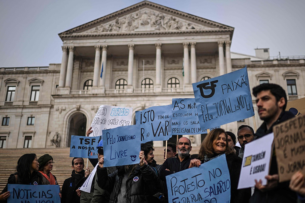 当地时间2024年1月10日,葡萄牙里斯本,全球传媒集团的记者在葡萄牙议会前举行抗议活动,他们举着标语捍卫自己的工作条件。