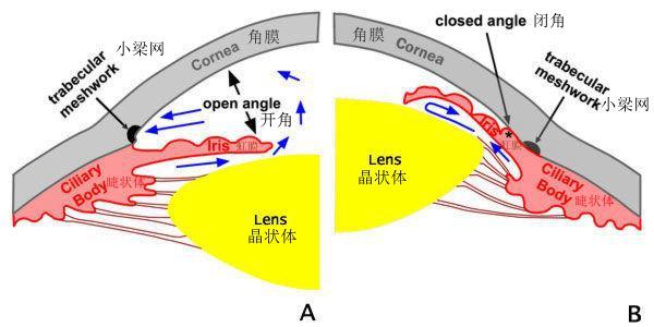 具有前房浅、晶状体厚、眼轴偏短的特点;这些是被公认的解剖特点和主要发病危险因素。正常人前房中央深度为2.5-3毫米,而闭角型青光眼病人的前房中央深度往往只有2.0毫米或更低,周边前房更浅。而且这类病人的晶状体又长得特别厚,整个眼球又偏短;正常人眼球长度为24毫米,闭角型青光眼病人眼球长度多在21-22毫米以下;所以这类病人眼内结构特别是前房角结构比较拥挤。这种情况下,虹膜和晶状体前表面接触容易紧密;房水通过瞳孔时阻力增加,房水流动受限后,后房压力增加,导致周边虹膜向前膨隆,会造成房角狭窄甚至关闭(这就是闭角型青光眼的发病机制-瞳孔阻滞)。并且晶状体的体积在人的一生中不断长大。所以对于闭角型青光眼的病人,医生常常会建议及时把混浊的晶状体去除,植入一个人工晶状体。晶状体的正常厚度约4-5毫米,而换成人工晶状体厚度小于1毫米,白内障手术后眼球前部的空间增大,对闭角型青光眼病人来说,前房会加深、房角会增宽。因此,白内障手术可阻断原发闭角型青光眼房角关闭的进程,是治疗早期病例的有效方法。但是,如果房角已经大部分黏连关闭则术后高眼压还是无法改善,需要白内障手术的同时进行房角分离术打开关闭的房角,重建房水在眼内的引流;或同时联合做小梁切除手术或其他滤过性手术,将房水引流至眼外以降低眼压。